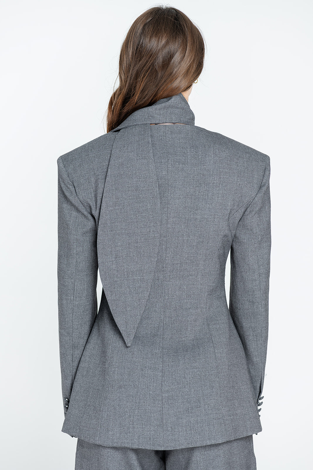 A sculpted tuxedo blazer with a sharply tailored silhouette. Designed with a deep V neckline, structured shoulders, and a clean button-front closure finished with fabric-covered buttons. The detachable scarf detail adds a refined, editorial edge — allowing the piece to shift effortlessly between minimal power dressing and elevated evening wear. Precise tailoring through the waist enhances the silhouette while maintaining a modern, confident feel.