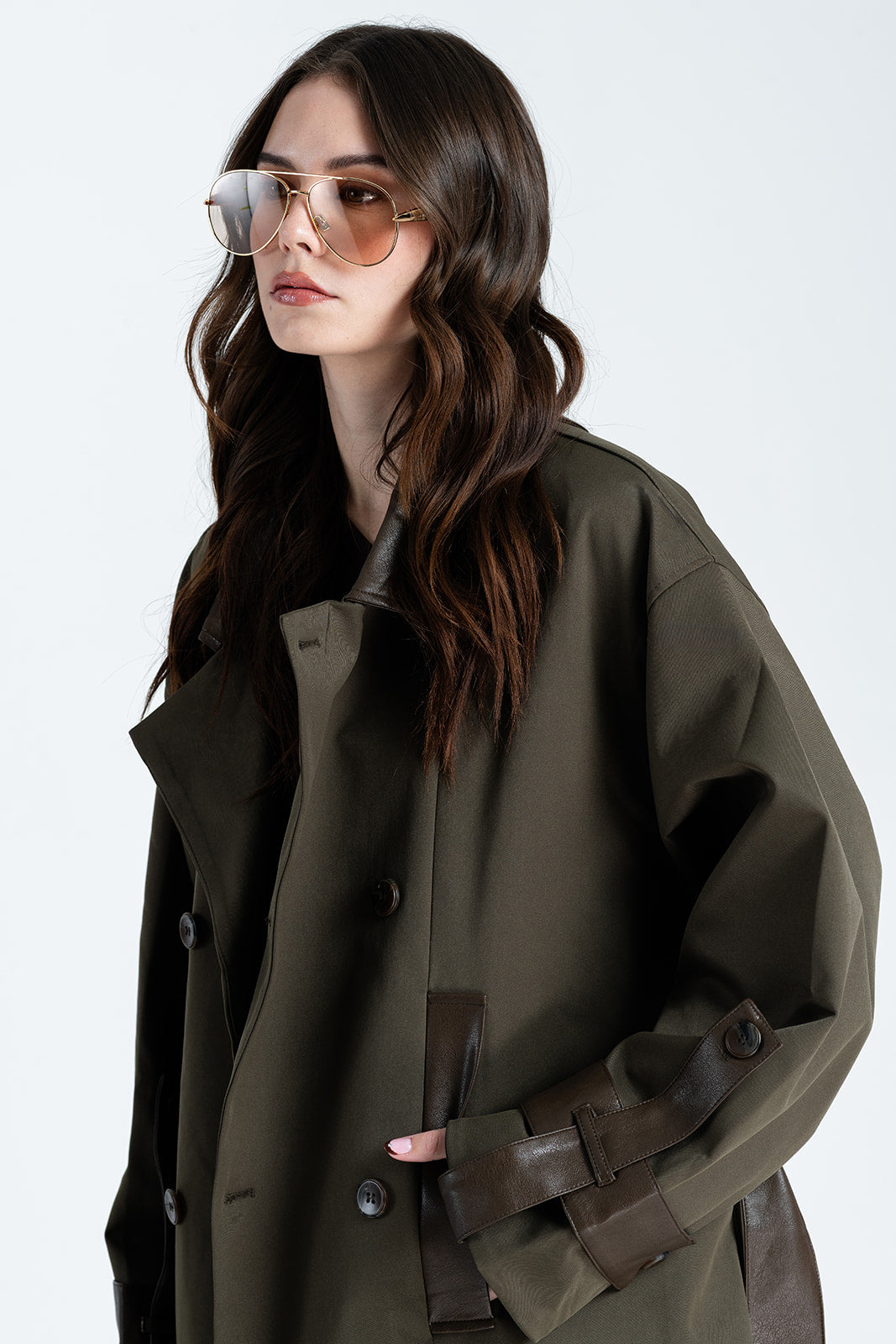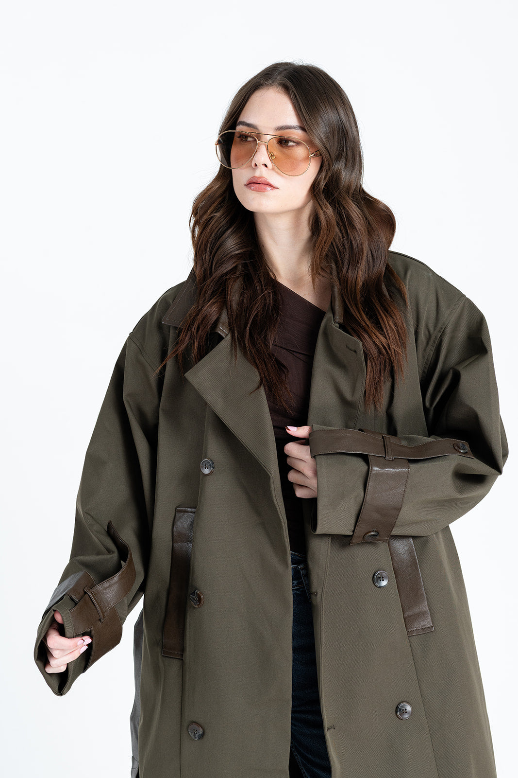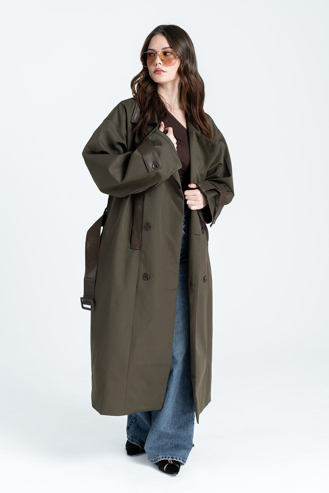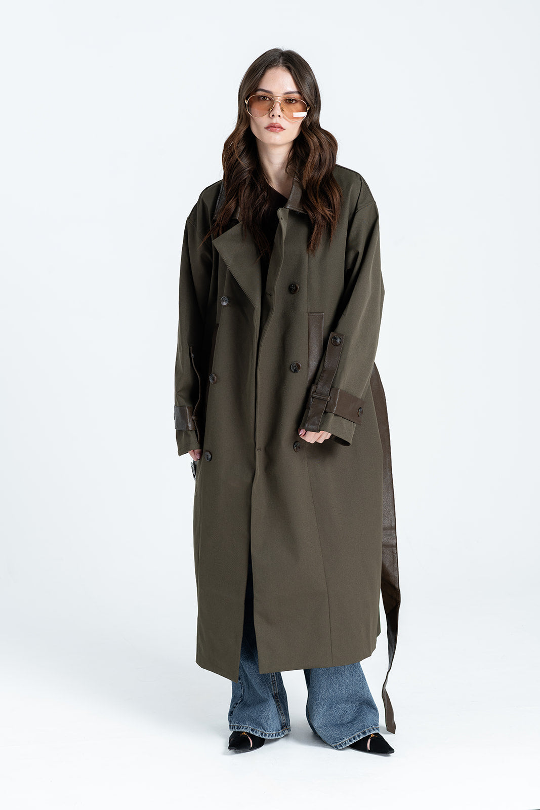 A longline oversized trench with structured shoulders and faux-leather detailing. Designed with wide lapels, a double-breasted front, adjustable cuff straps, and a fluid straight silhouette. The contrast faux-leather trim adds definition while keeping the look modern and clean.
